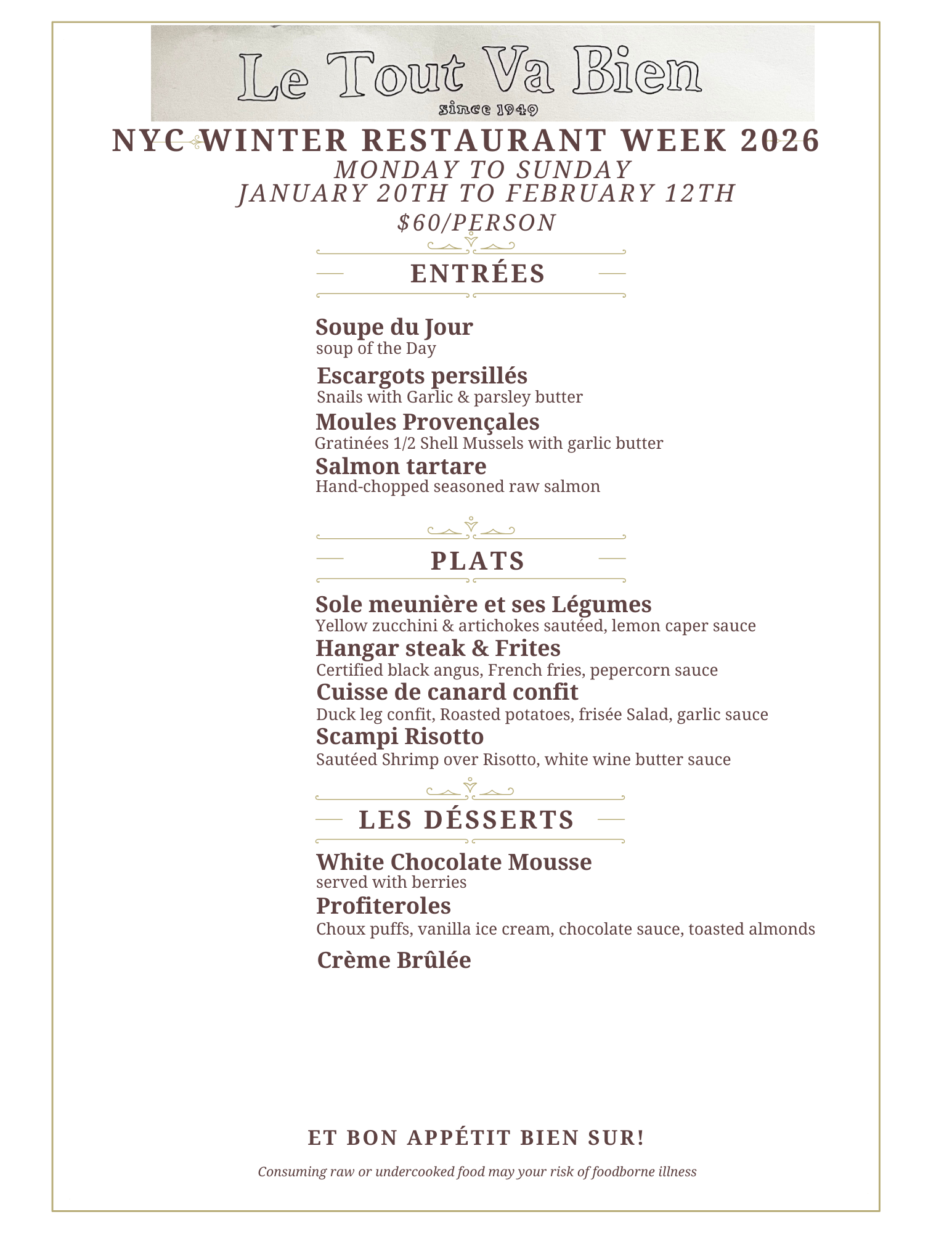 Welcome to Le Tout Va Bien, a charming French bistro nestled in the heart of New York City. Since opening our doors in 1949, we have proudly served authentic French cuisine, bringing a little piece of Paris to the bustling streets of Manhattan.